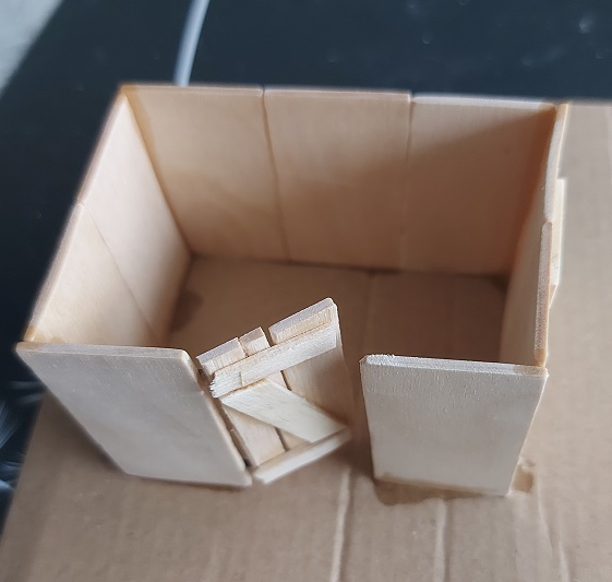 Eines Abends hatte ich noch kleine Holzreste und vor mir Stand eine leere Getränkedose. Schnell vier Wände und Tür gebastelt.