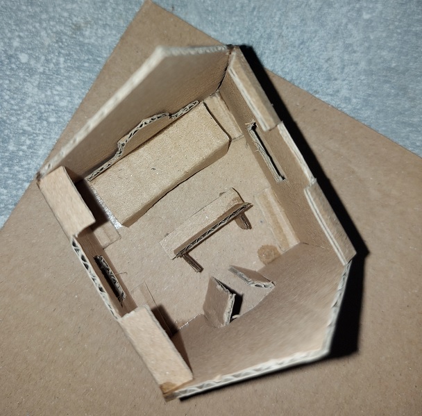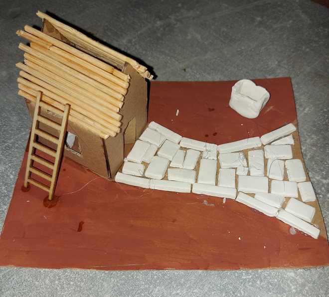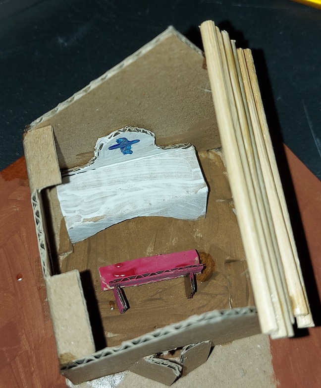 Hier ensteht eine kleine Kapelle aus Pappe. Mit etwas Glück kann man den Altar und die Gebetsbank erkennen. Leider wird bei der Kapelle im Moment das Dach repariert.