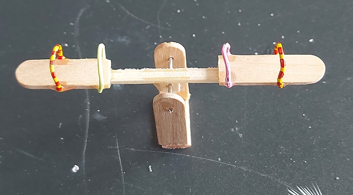 Eine kleine Wippe aus Holzresten und bunten Heftklammern.