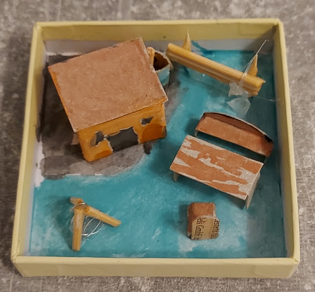 Das klingt jetzt toller als es ist. Ich habe lediglich aus Langeweile, einen kleinen Grillplatz aus Pappe und Holz, in eine kleine Schmuckbox aus Pappe gesetzt, und zwar in den Deckel.